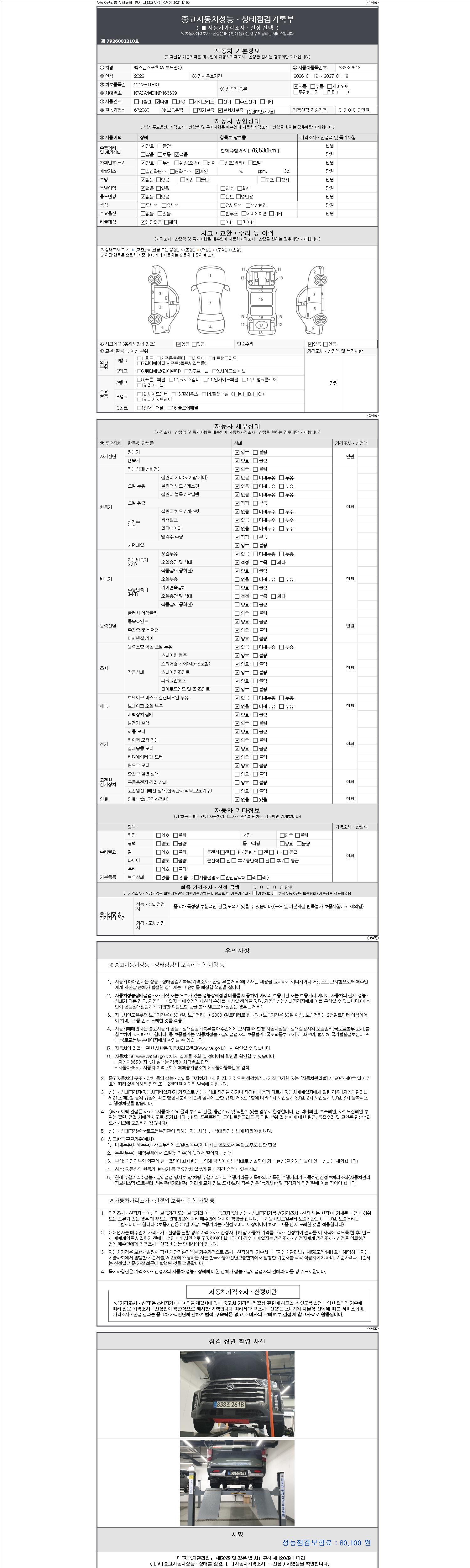 | 주행거리 | 76,530 km | 차량번호 | 838조2618 | 사고유무 | 성능기록부 참조 | 제시번호 | 제 2147483647 호 |