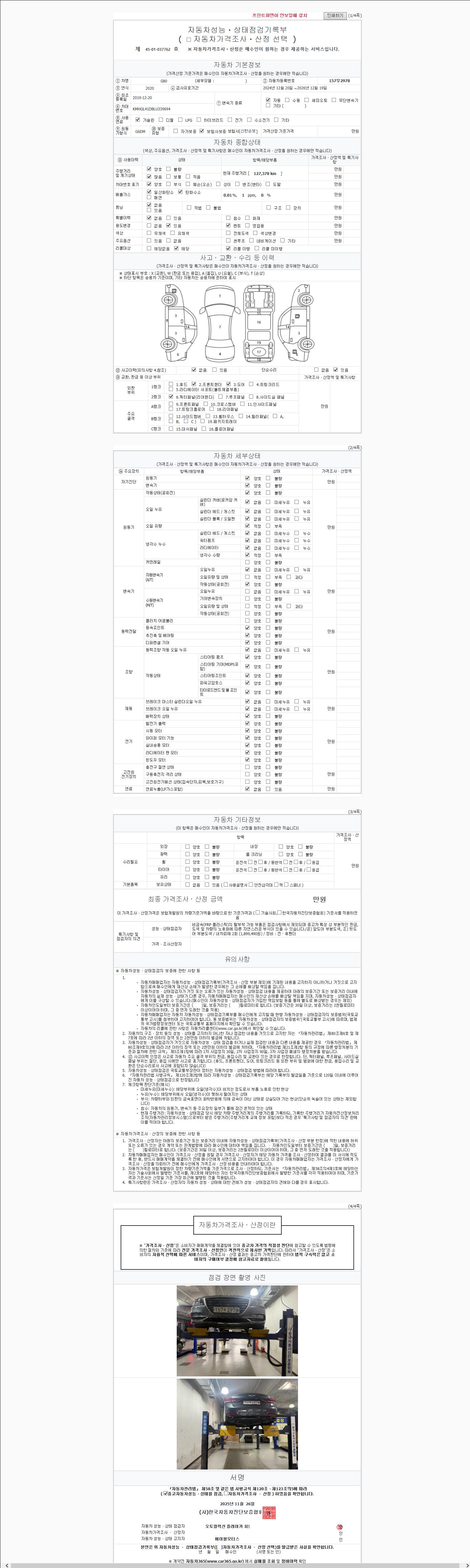 | 주행거리 | 127,378 km | 차량번호 | 157우2978 | 사고유무 | 성능기록부 참조 | 제시번호 | 제 2147483647 호 |