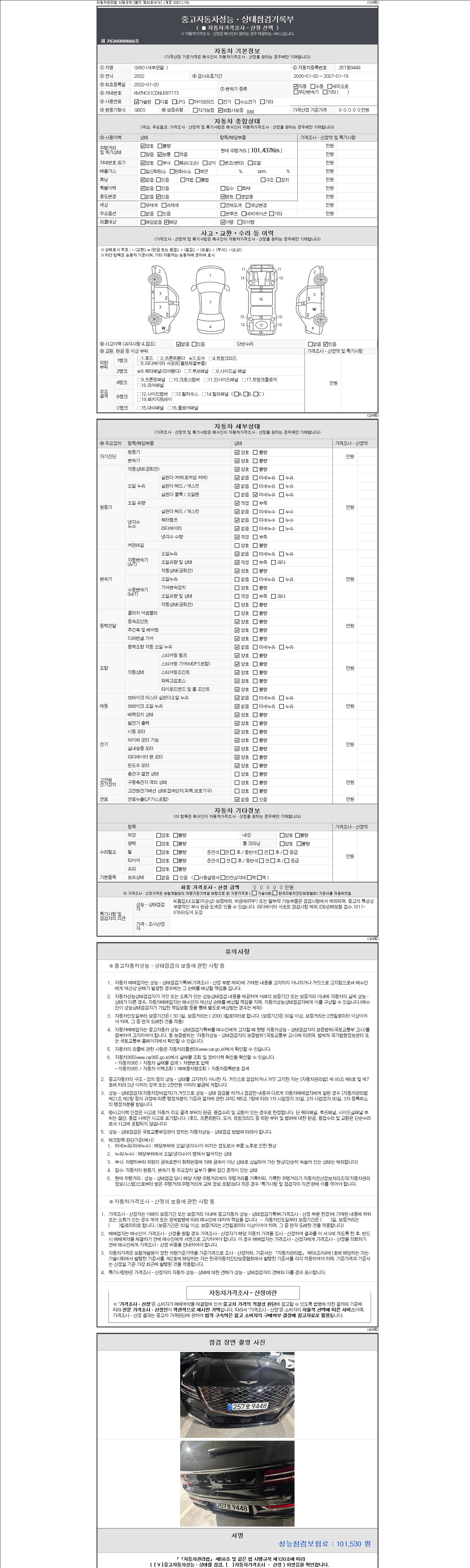 | 주행거리 | 101,437 km | 차량번호 | 257로9448 | 사고유무 | 성능기록부 참조 | 제시번호 | 제 2147483647 호 |