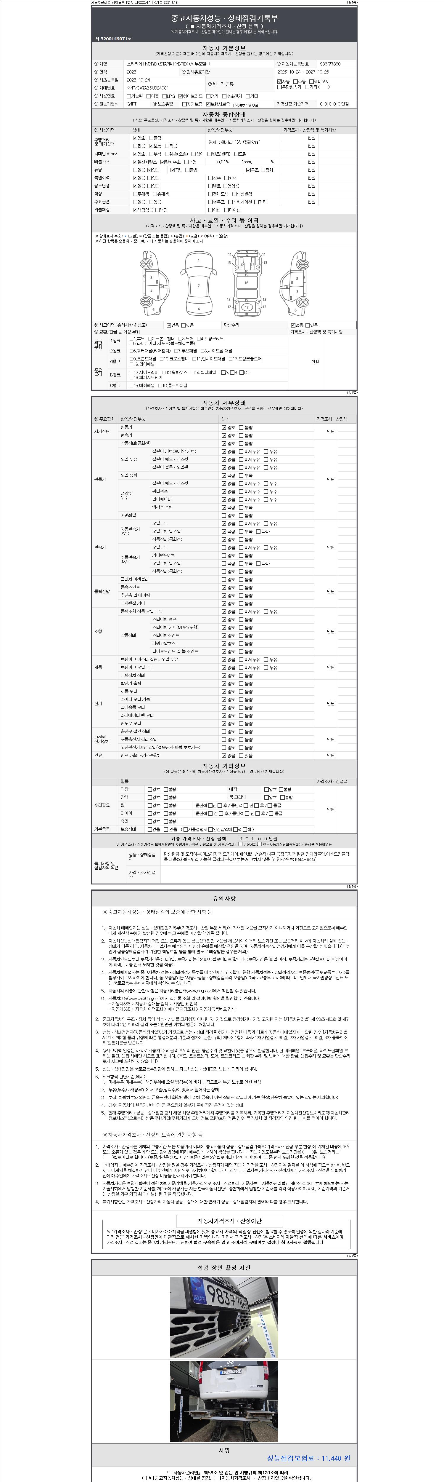 자동차관리법 시행규칙 제120조의 규정에 따라 별지 제 82호서식 《중고자동차 성능, 상태점검 기록부》를 발행한 성능, 상태점검자 및 매매자는 아래의 보증기간 또는 보증거리 이내의 중고자동차, 성능점검 기록부에 기재된 내용과 자동차의 실제 성능, 상태가 다른 경우 계약 또는 관계법령에 따라 매수인에 대하여 책임을 집니다.